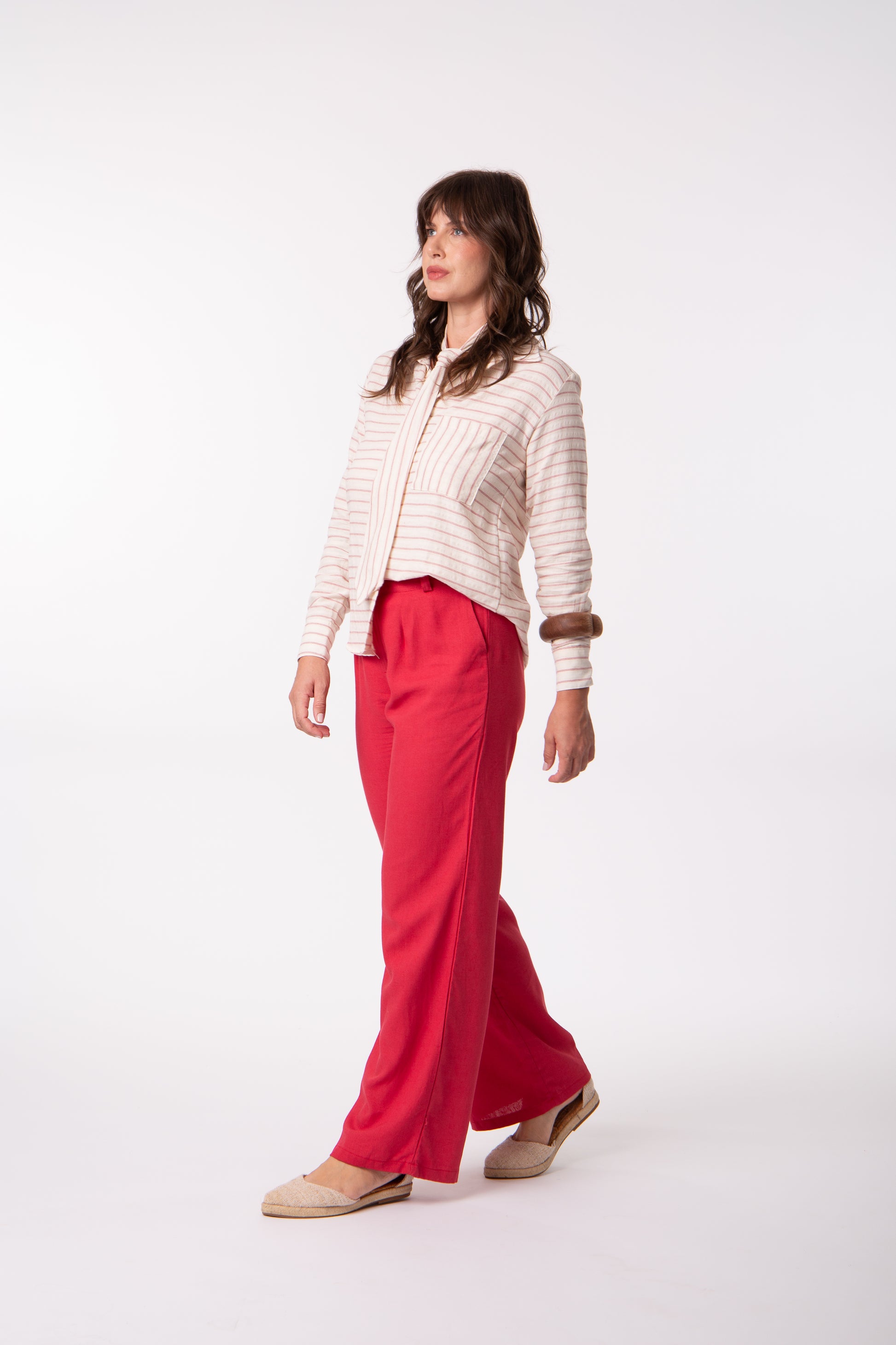 Produzida em linho com viscose, tecido que combina a textura natural do linho com o caimento suave da viscose. A cor vermelho goiaba adiciona um toque luminoso ao visual, destacando a peça em composições modernas.